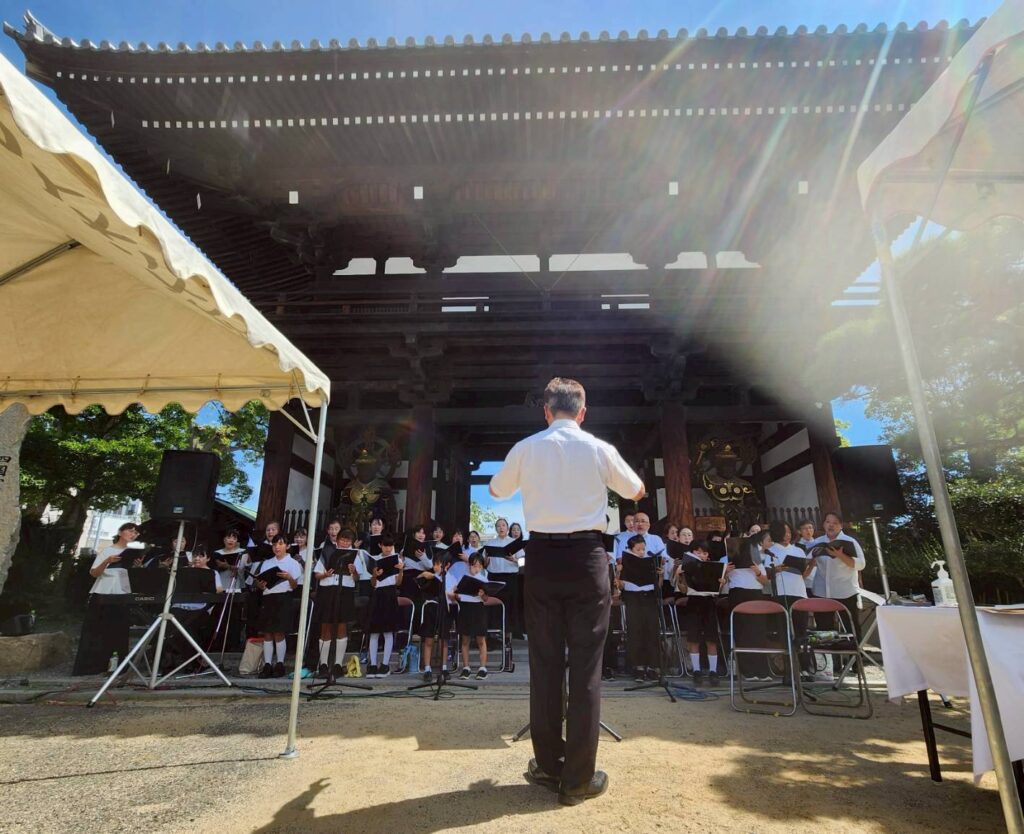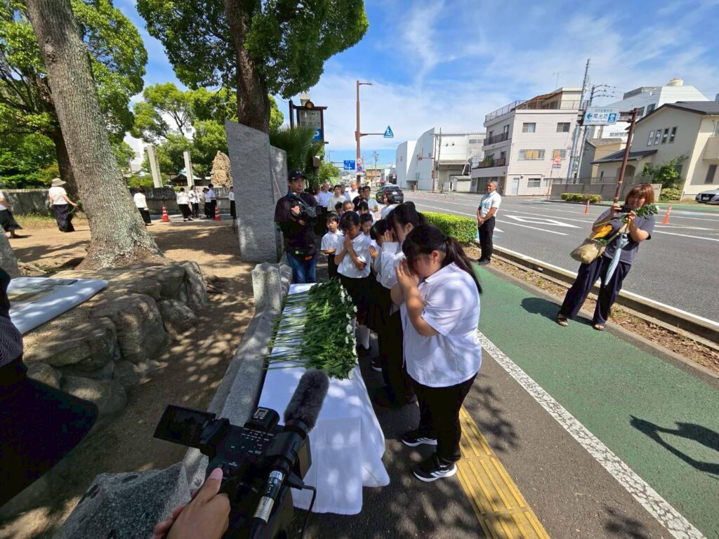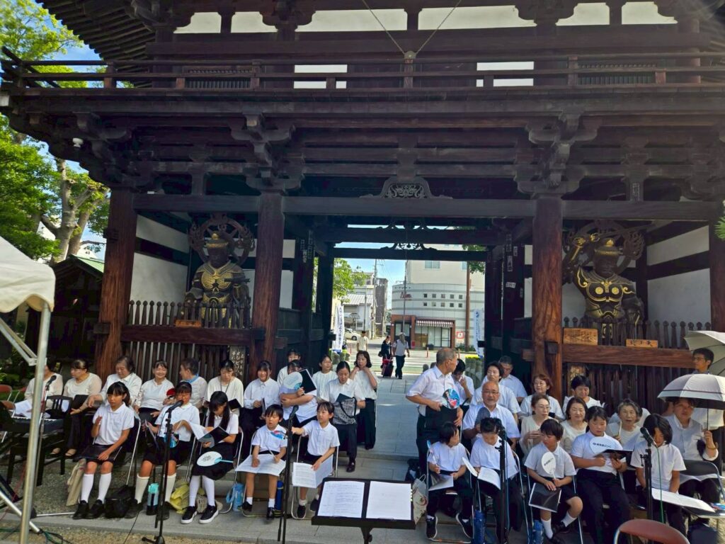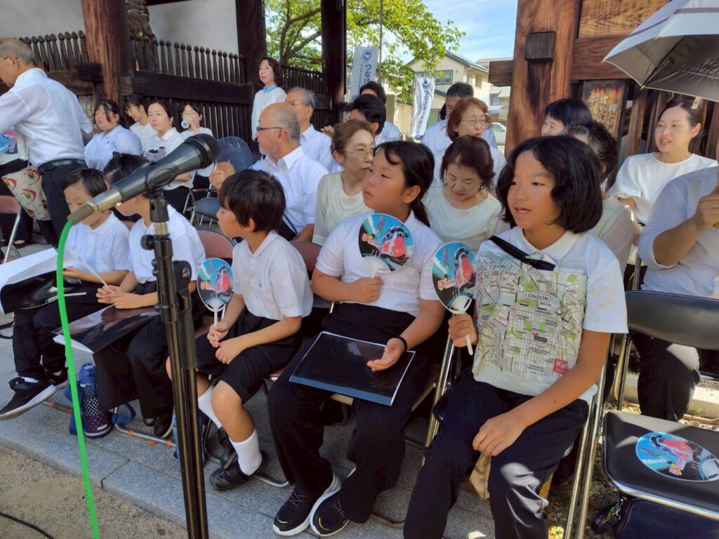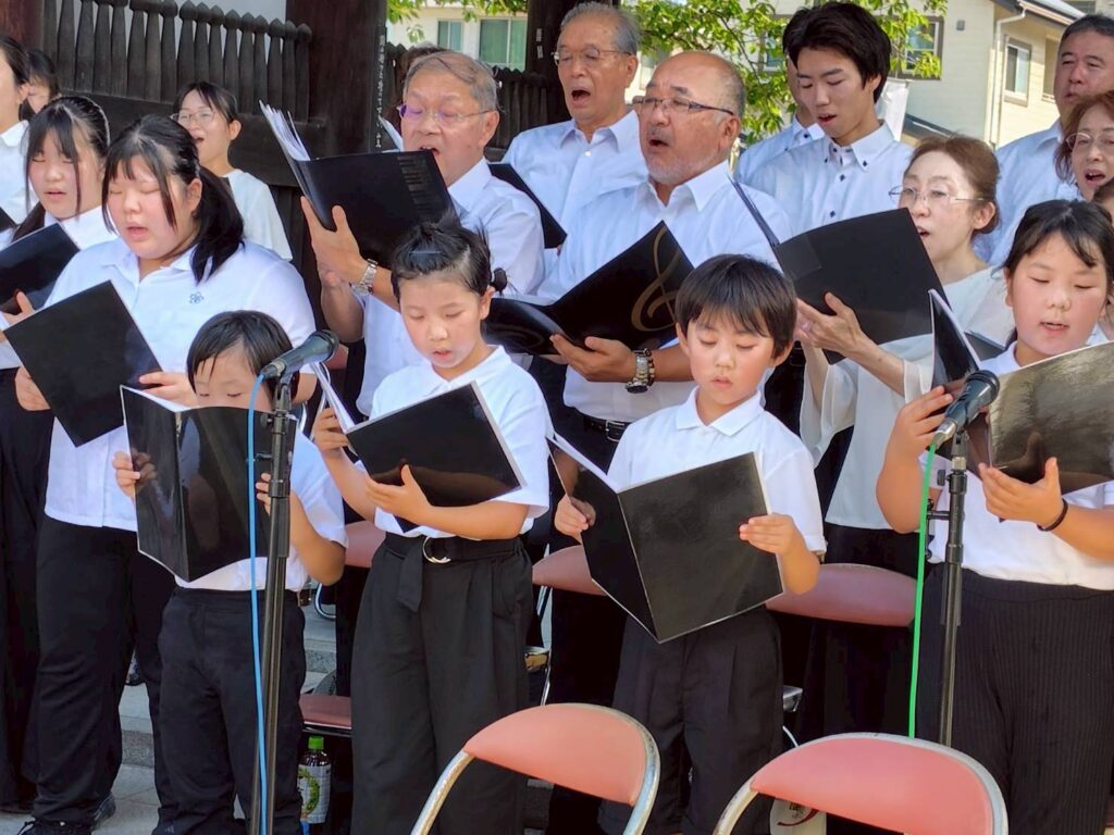 2025年8月6日(水)、今治市南光坊にて「戦災死没者追悼献花と平和の鐘を鳴らす式典」が開催され、ジュニアコーラスSMILEが参加しました。式典には約200人の市民が参加しました。
